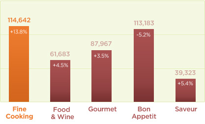 Fine Cooking is enjoying outstanding success in the marketplace – with growth in rate base, subscriptions and single copy sales. Especially on newsstand, where most magazine unit sales are sharply trending down, Fine Cooking is up and outsells well-known competitors like Gourmet, Bon Appetit and Food & Wine, despite having a significantly higher cover price than the other epicurean titles.